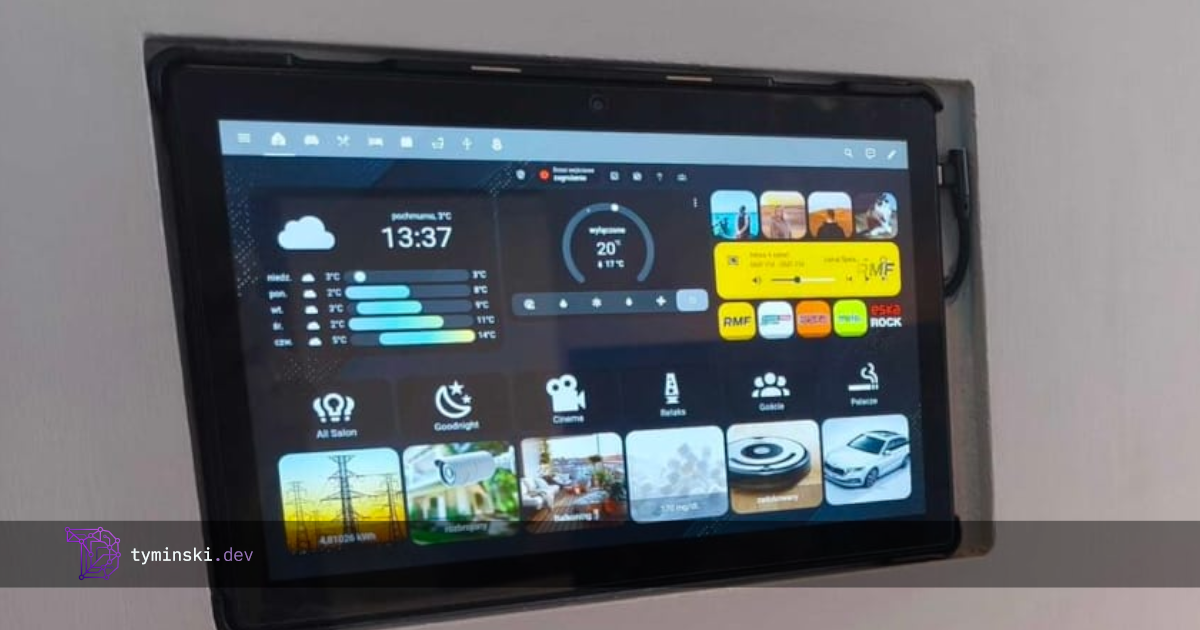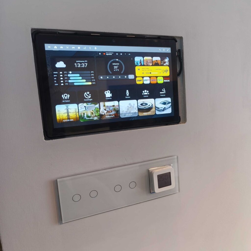 Marzyłem od zawsze o centrum sterującym w postaci tabletu zamontowanego na ścianie w salonie, żeby zawsze mieć podgląd w całość systemu. Wszystkie włączniki i czujniki na wyciągnięcie ręki. Rewelacja. Pomyślałem sobie: „co stoi na przeszkodzie?„. Odpowiedź brzmiała nic 🙂