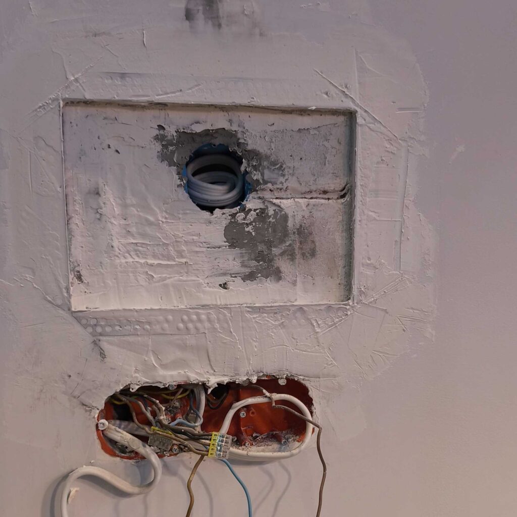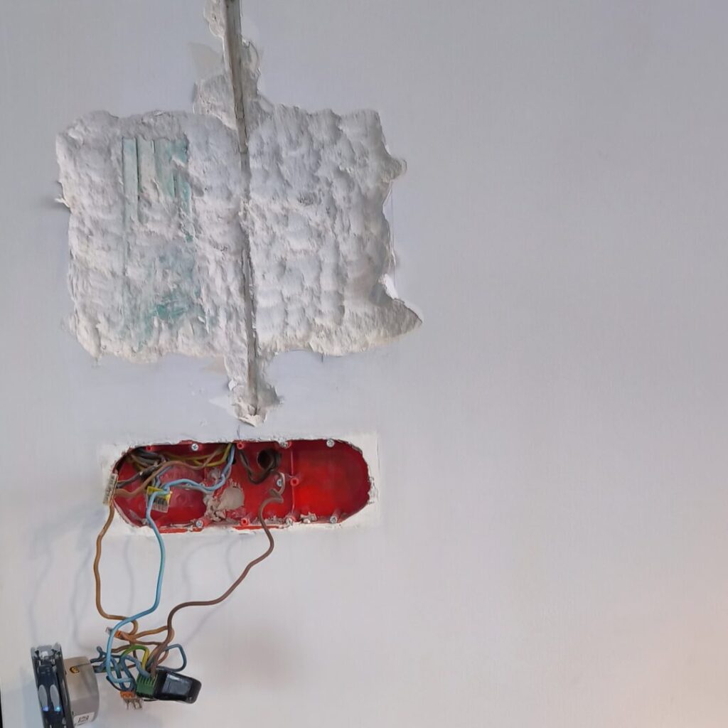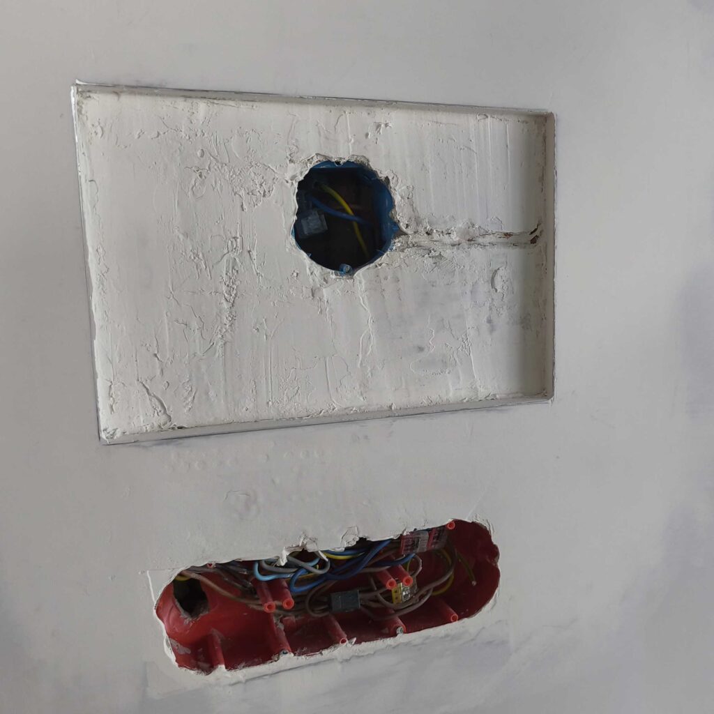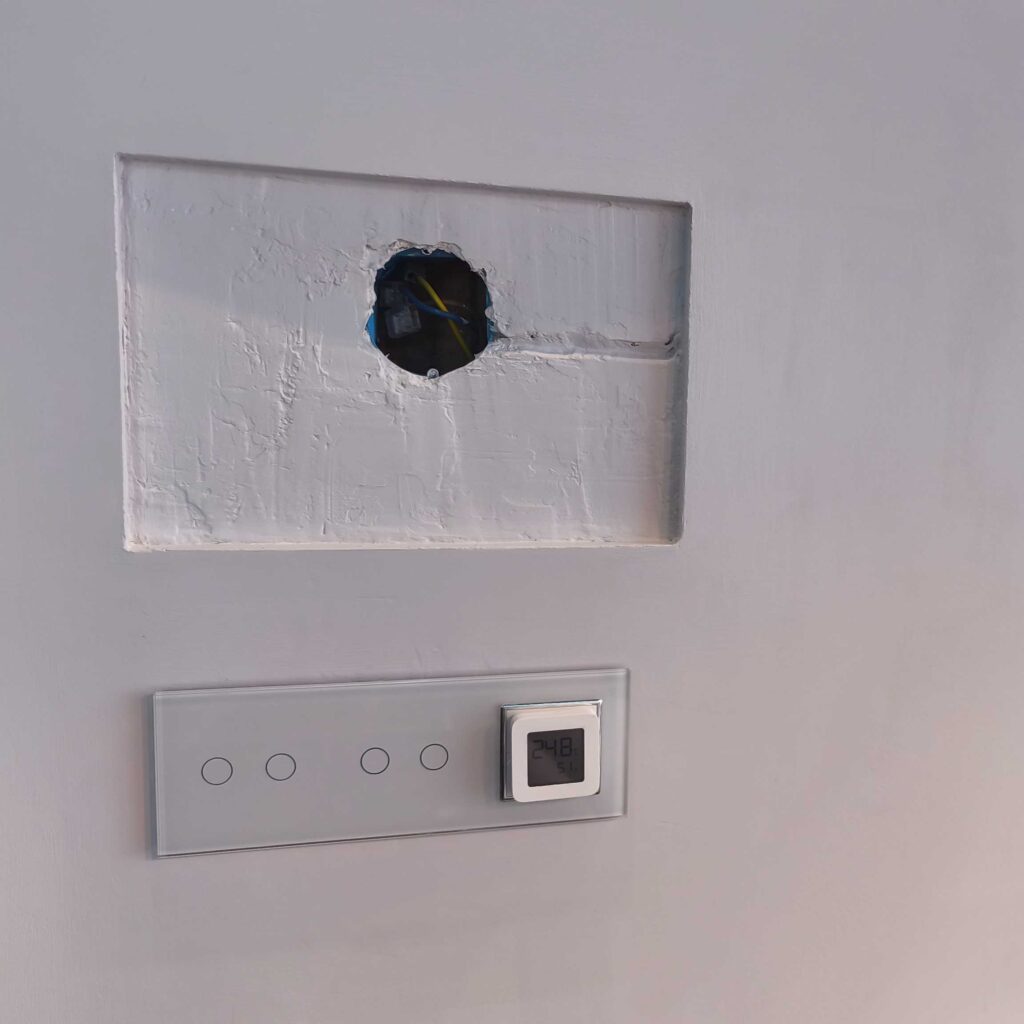 Pierwsze koty za płoty. Podkułem tynk na wymiar tabletu. I stało się to czego w sumie się spodziewałem czyli kable, które skutecznie utrudniły zadanie zlicowania tabletu ze ścianą. Na szczęście udało się podkuć pod przewodami i cofnąć je oraz dołożyć przewód do ładowarki. Osadzenie puszki z miejscem na ładowarkę i sonoffa poszło bardzo sprawnie. Gipsowanie, osadzanie narożników, gładziowanie, szlifowanie oraz malowanie zajęło praktycznie cały weekend. Było warto.