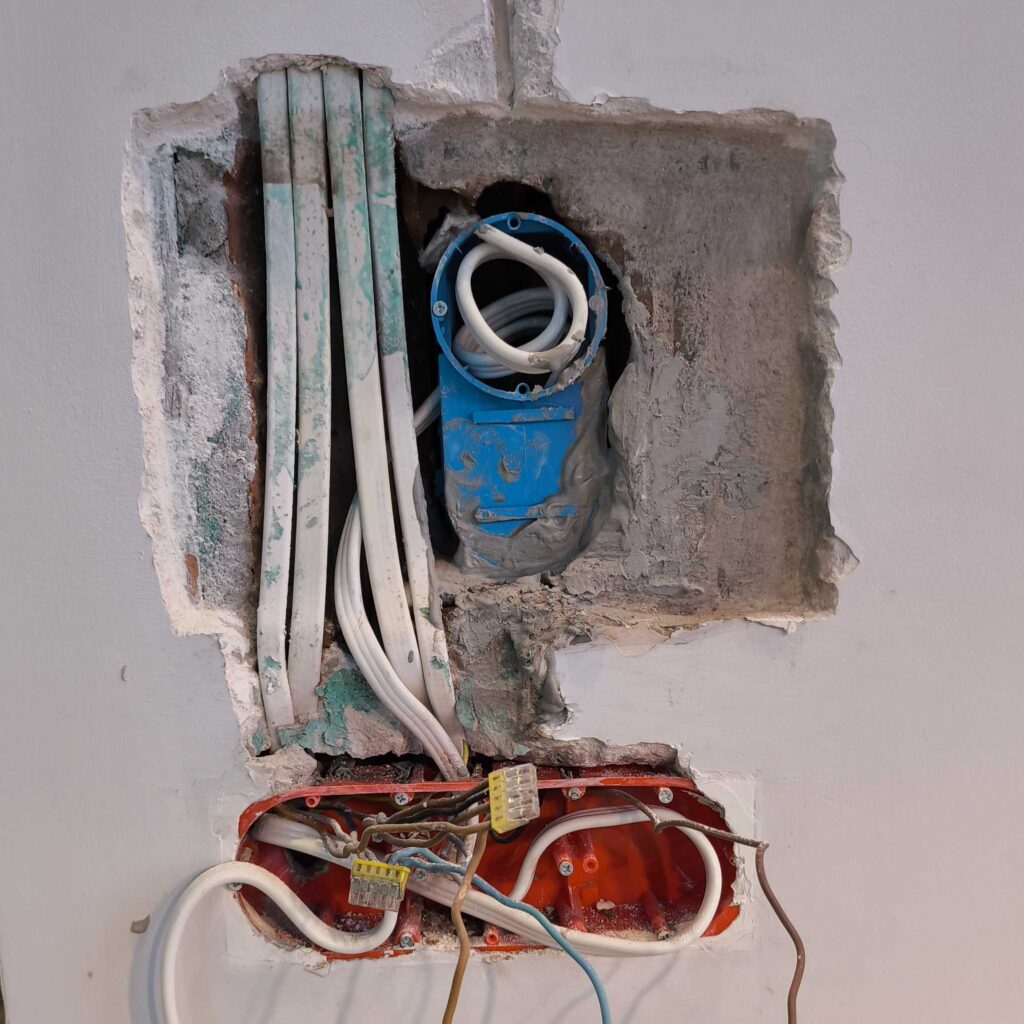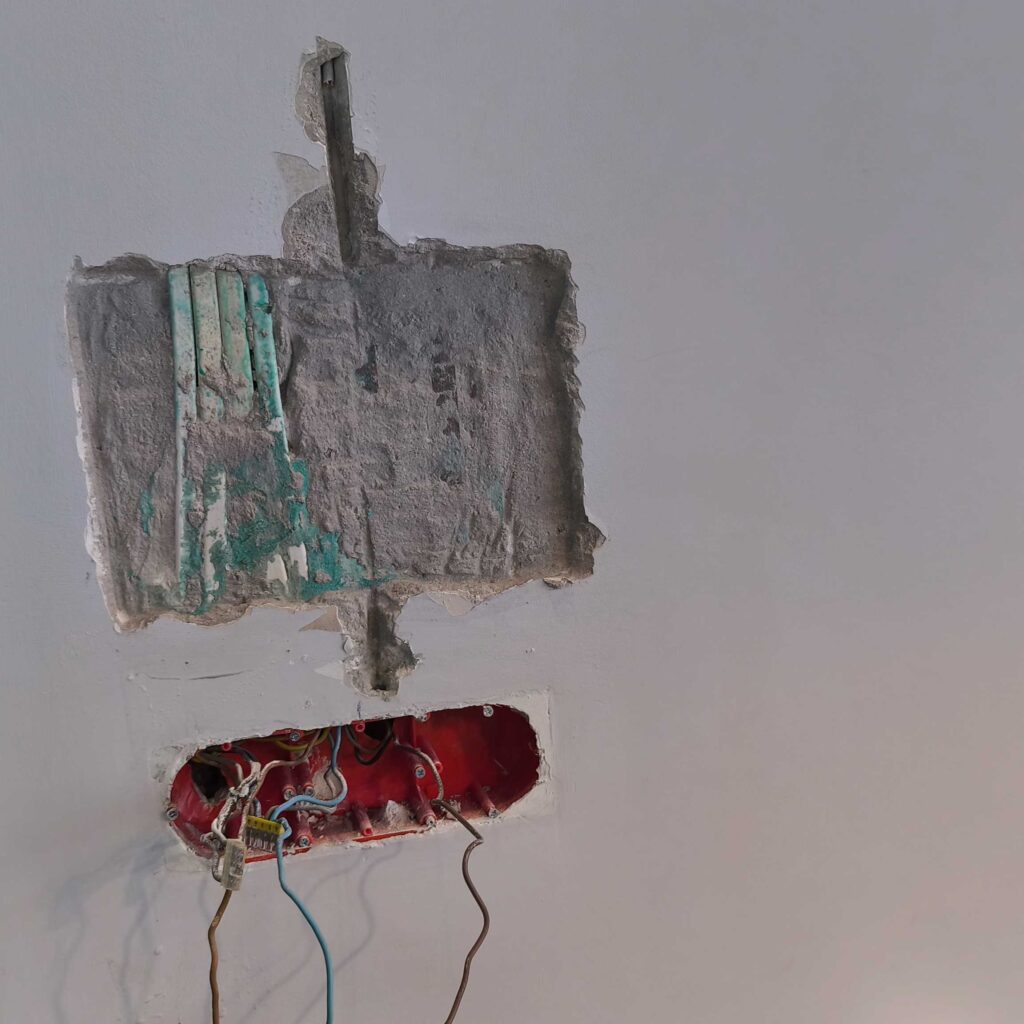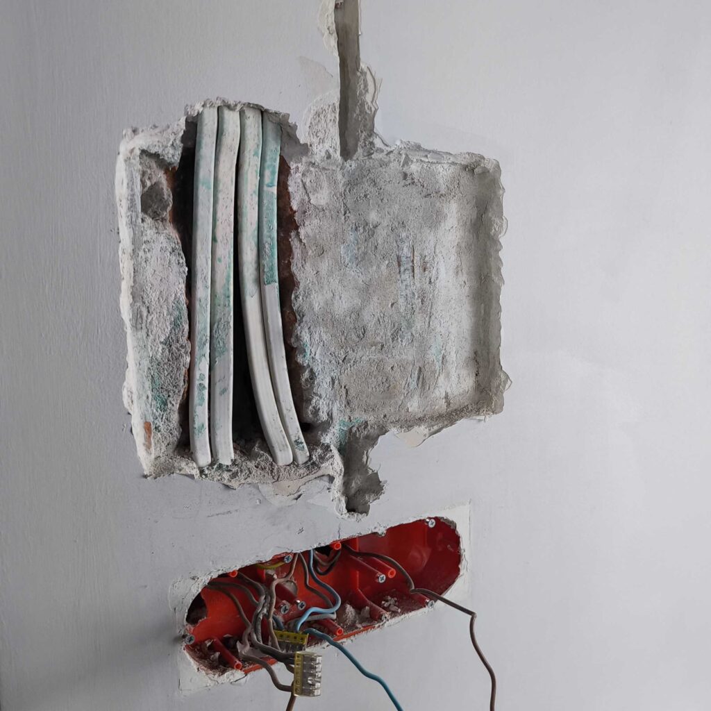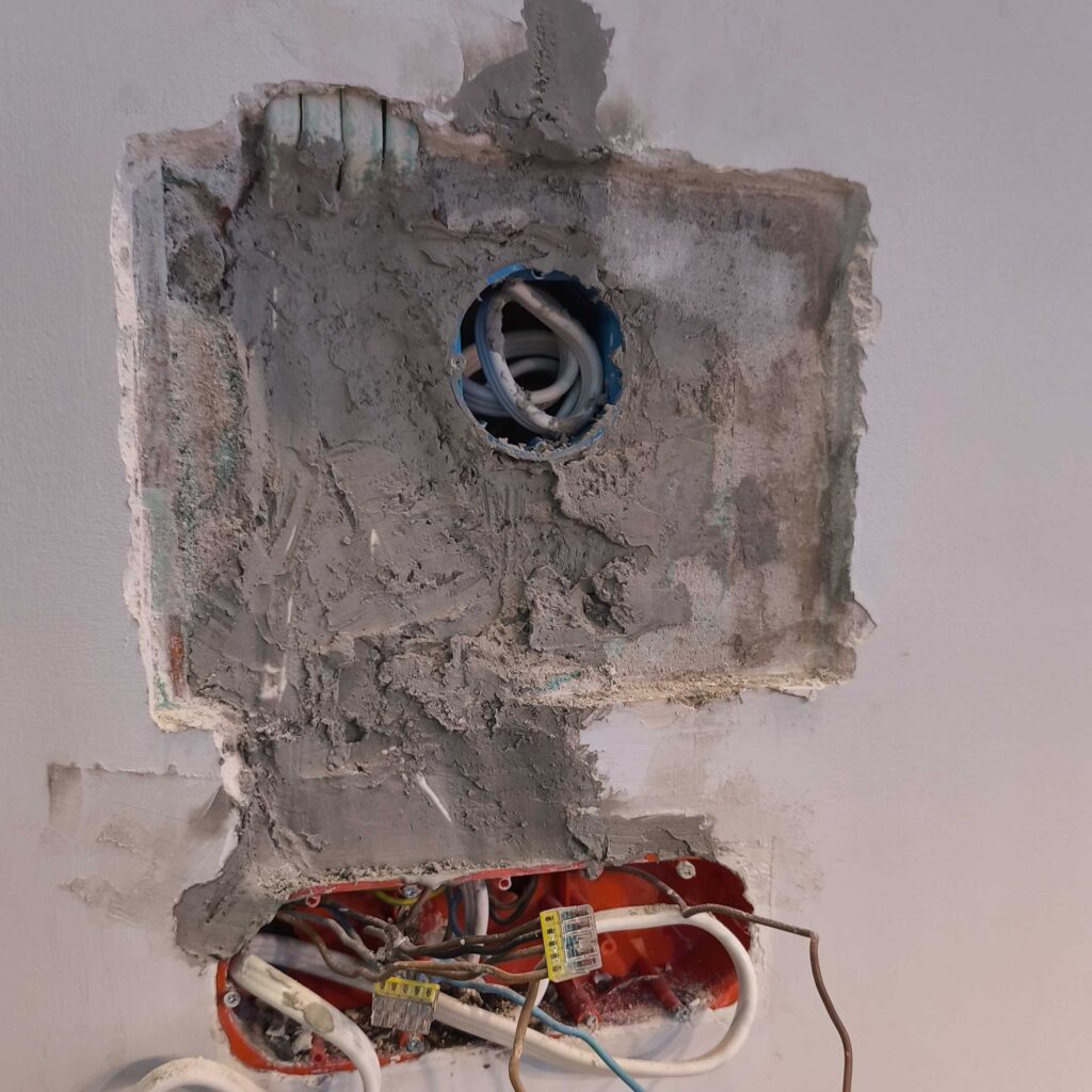 Pierwsze koty za płoty. Podkułem tynk na wymiar tabletu. I stało się to czego w sumie się spodziewałem czyli kable, które skutecznie utrudniły zadanie zlicowania tabletu ze ścianą. Na szczęście udało się podkuć pod przewodami i cofnąć je oraz dołożyć przewód do ładowarki. Osadzenie puszki z miejscem na ładowarkę i sonoffa poszło bardzo sprawnie. Gipsowanie, osadzanie narożników, gładziowanie, szlifowanie oraz malowanie zajęło praktycznie cały weekend. Było warto.