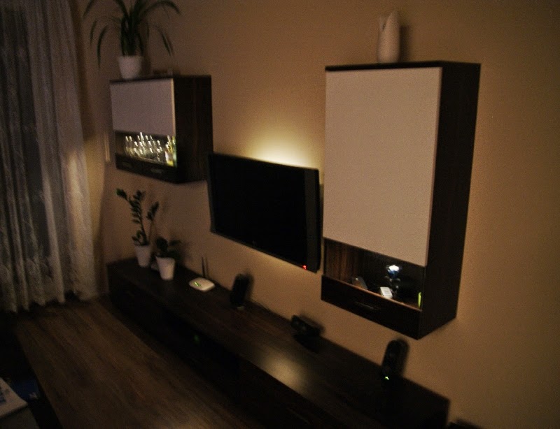 Udało mi się zmajstrować podświetlenie półek. Z pozostałych 30cm paska ledowego zrobiłem podświetlenie TV. Podoba się Wam ?