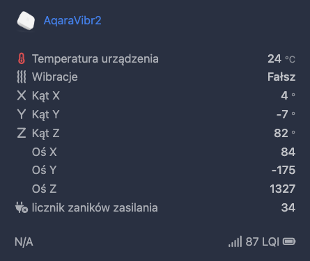 Czujnik jaki zastosowałem to AQARA DJT11LM na ZigBee. Jest to w sumie czujnik wibracji ale dzięki wbudowanym żyroskopom i encjom wskazującym nachylenie idealnie nadaje się do mojego zastosowania. Czujnik posiada także wbudowany termometr. Ja akurat mam termometry na ścianie, ale jak ktoś nie potrzebuje mieć wyświetlacza to można śmiało z tego czujnika temperaturę pobierać.