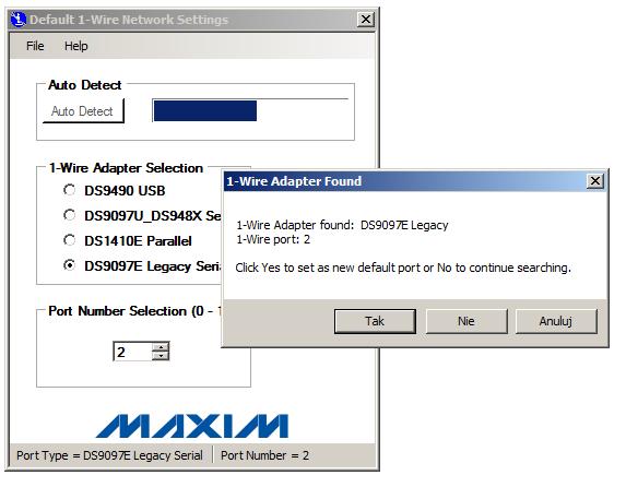Drążyłem temat kilka dni. Razem ze sterownikami 1-wire, zainstalował się program OneWireViewer, który ma bardzo fajny konfigurator. Można nim wykryć automatycznie czy i do jakiego portu podłączony jest adapter 1-wire i jakiego rodzaju jest to urządzenie.